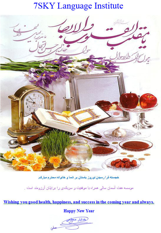 مدیریت موسسه آموزش زبانهای خارجی هفت آسمان وعمید ، فرارسیدن سال نو خورشیدی را به کلیه همکاران محترم، اساتید زحمت کش، زبان آموزان بانشاط و والدین گرامی آنها تبریک گفته و آرزوی سلامتی و رونق در سال جدید برای همه آنها از خداوند منان مسئلت دارد.