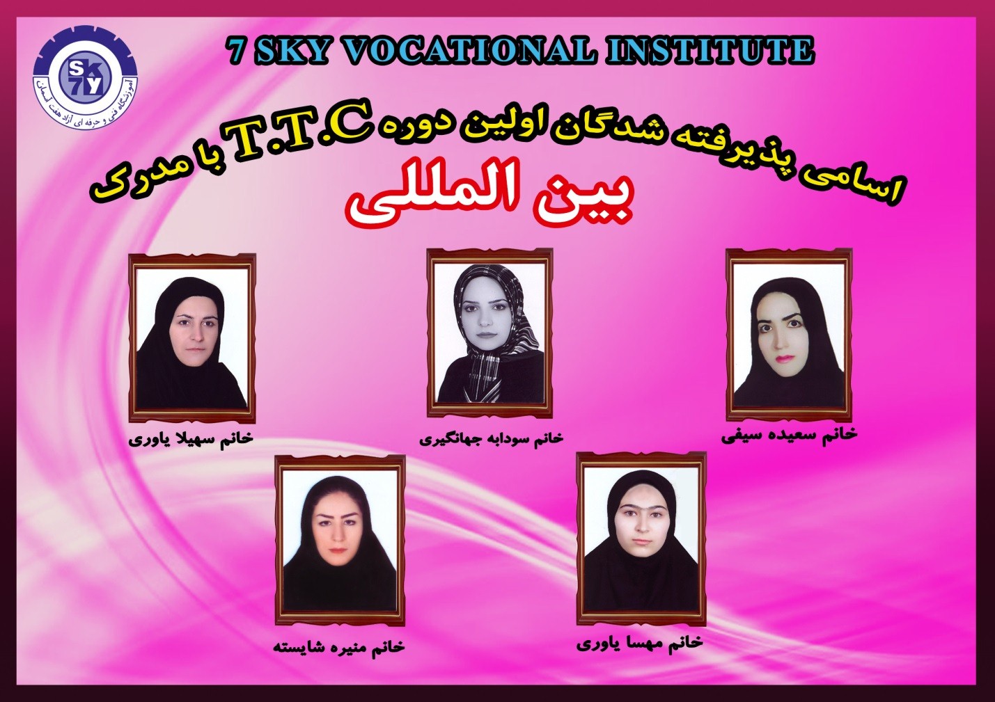سرکار خانم ها سعیده سیفی، سهیلا یاوری، مهسا یاوری، سودابه جهانگیری و منیره شایسته موفقیت شما در اخذ مدرک بین المللی TTC از آموزشگاه هفت آسمان تبریک عرض می نماییم.